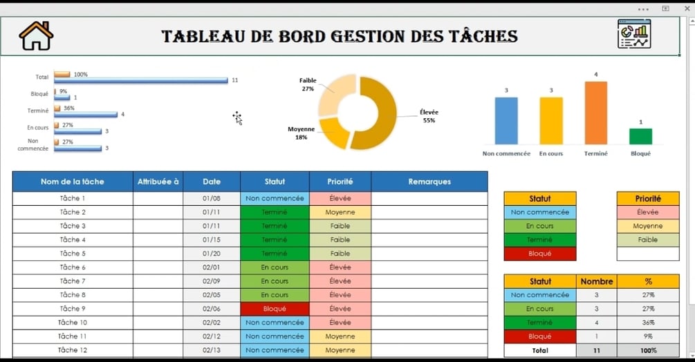 Un tableau de bord de gestion des tâches dans Excel est un outil interactif qui permet de planifier, suivre et piloter efficacement l’avancement des tâches dans un projet ou au sein d’une équipe. Il centralise toutes les informations essentielles liées aux tâches : échéances, priorités, responsables, statuts, et pourcentages d’avancement.