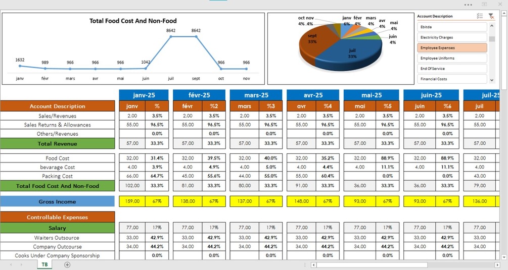 Ce tableau de bord financier présente une synthèse mensuelle de la performance d'une entreprise. Il compare les revenus, les coûts et les dépenses contrôlables pour les mois.